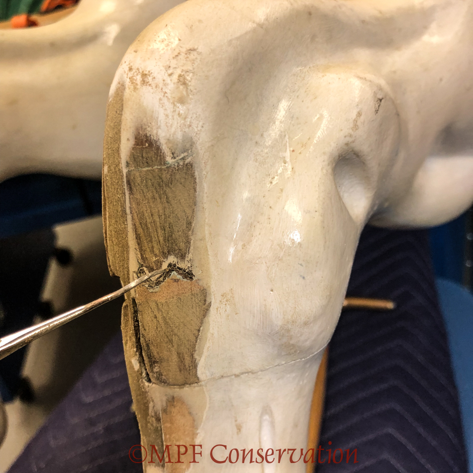 Previous repairs are revealed along with losses within the interior of the butted scarf joint, which correspond with the trajectory of the tail screw.