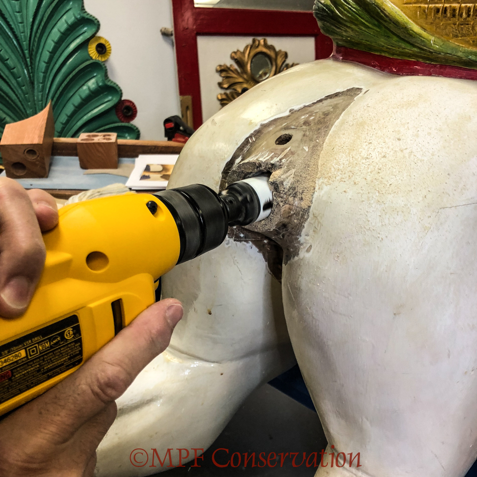 The first step in the mortise reboring phase is using a hole saw bit to establish the proper trajectory of the mortise walls.