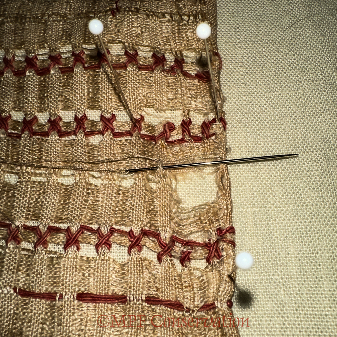 Pinning and beginning weaving repair threads with the weft threads.