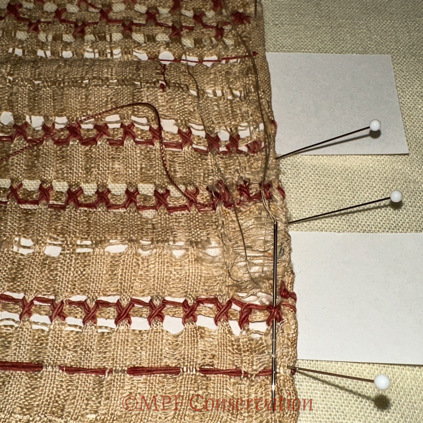 Added maroon threads to secure embroidery within drawn thread area.