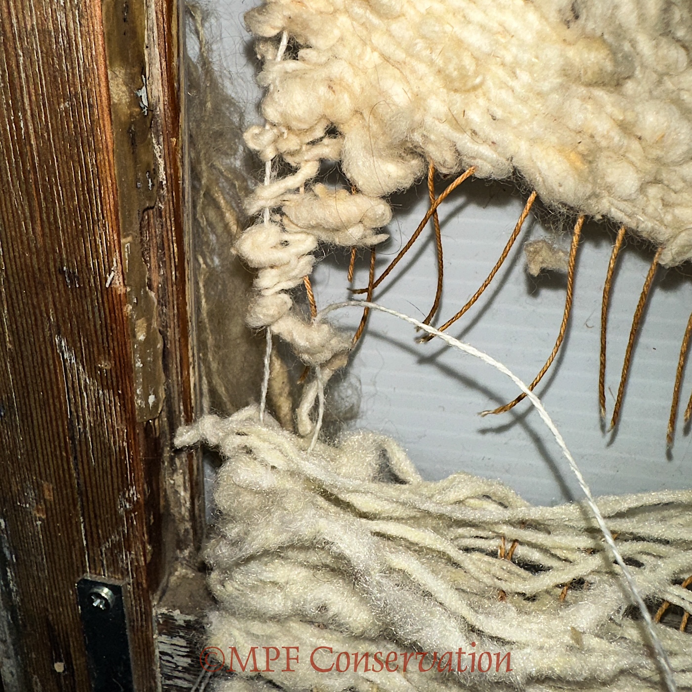 This shows the way I wove throughout, taking my new warp line through the roving weft, then pulling the old warp line out…