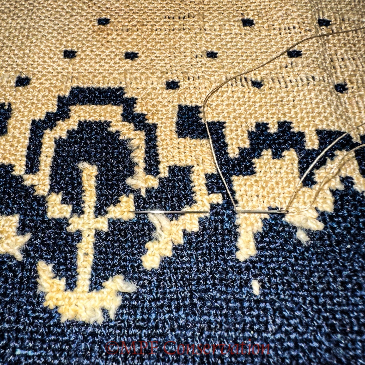 Linen thread buried in the blue so Kate could travel to the damaged linen threads.