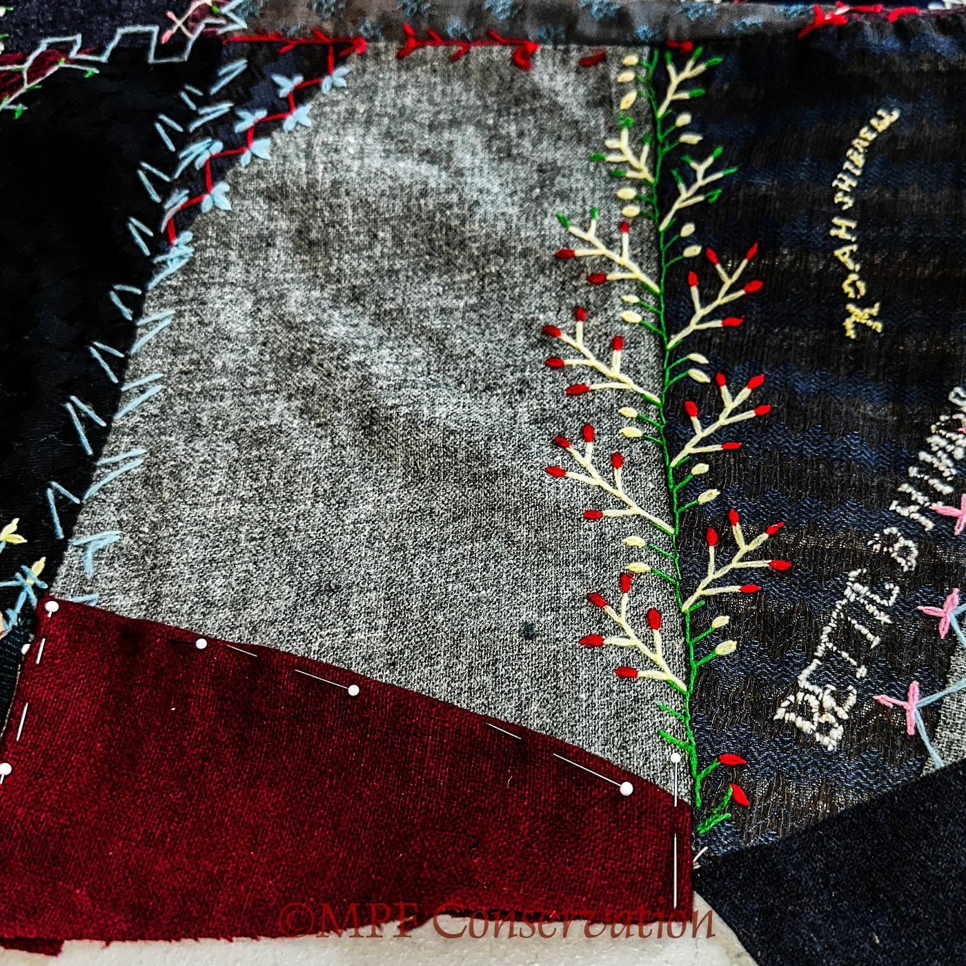 A piece of brick-colored historic fabric is cut to the area and pinned…