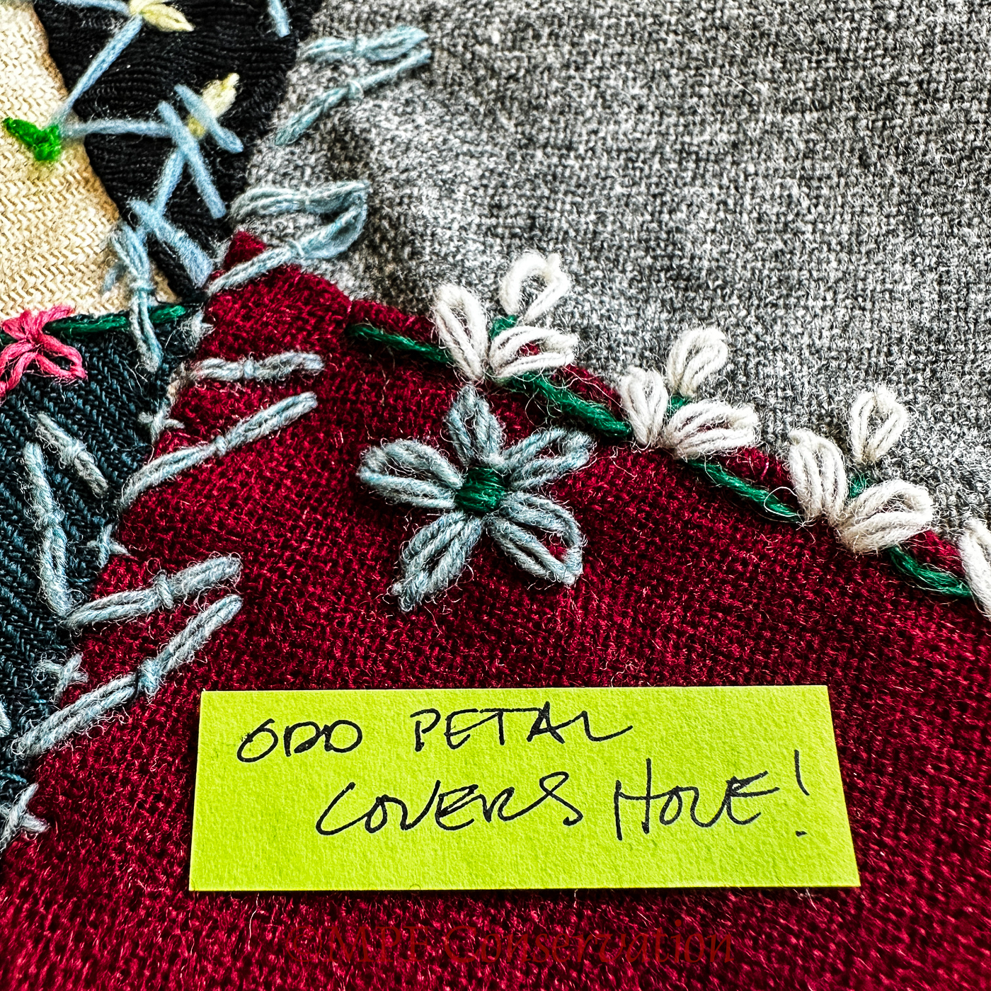 Here an unusual version of my flower with an infilled green center covers/repairs a small hole in the brick fabric.