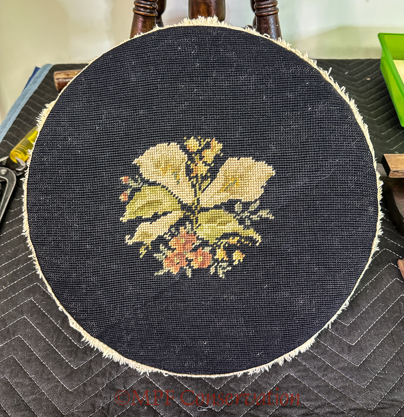 Restoration of a Floral Needlepoint Seat ca 1900